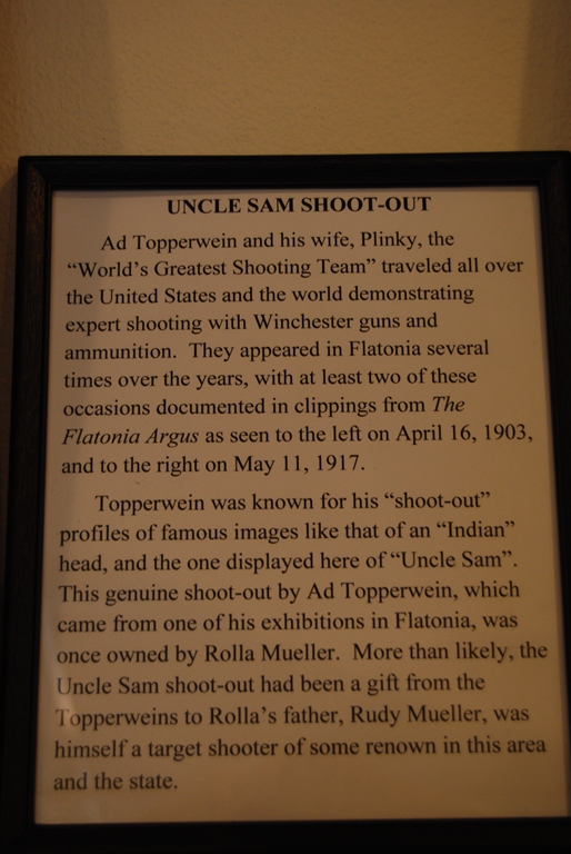 Now viewing: Comal County Genealogy Society » Photo Album » Field Trips » 2011 July: Schulenburg and Flatonia » Info about sharp shooters Ad & Plinky Topperwein, Flatonia, TX