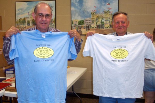 Photo Album Now viewing: Comal County Genealogy Society » Photo Album » Meetings » 2007 May Meeting » 08 May 2007 Meeting 2007 May MeetingMay 2007 Meeting 08 May 2007 Meeting CCGS T-shirts - Clarence Scheel, Otto Hill modeling CCGS T-shirts « »