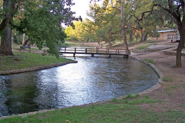 The Comal Springs, the largest group of natural springs in Texas. The flow from the springs feeds Landa Lake and the Comal River.