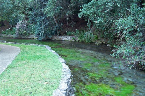 The Comal Springs, the largest group of natural springs in Texas. The flow from the springs feeds Landa Lake and the Comal River.